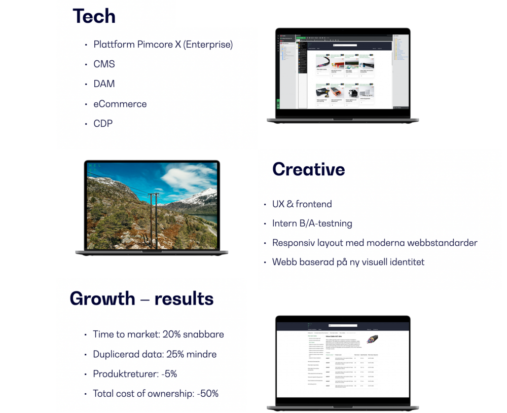 Alla utmaningar, behov och önskemål har tillgodoses av Pimcores bredd och funktionalitet. CMS för att bygga en UX-vänlig webbplats med rikt innehåll av guider, information, kunskap och erfarenhetsdelning och MDM och Ecom, för både produktpresentation och försäljning. Pimcores DAM-funktion används för länkning av pdf-produktbeskrivning, bilder och teknisk data. Etta av de primära tekniska målen var att utveckla enkel och smidig hantering av stora mängder produkter och data, vilka idag uppfyllts både internt och externt.