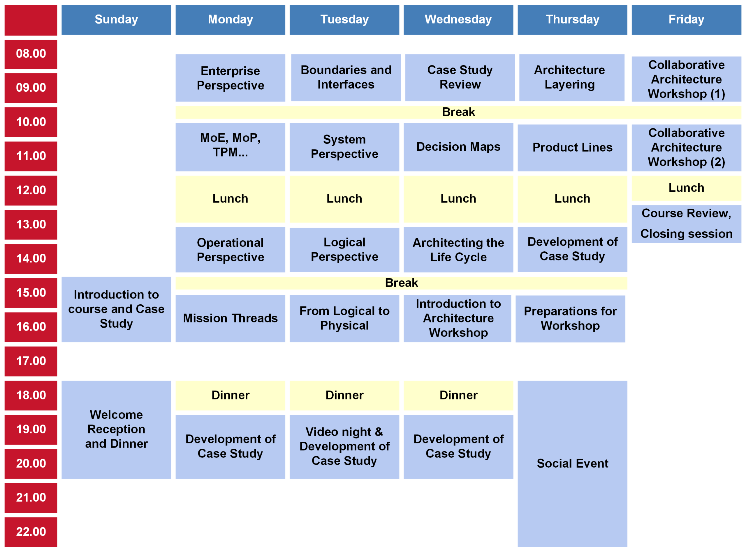 Under kursen får du lära dig hur arkitekten tar fram en arkitektur med stöd av Systems Engineering och en arkitekturprocess i sex steg. Utöver föreläsningarna arbetar du i grupp med en case study, som du vidareutvecklar under veckan och presenterar den sista kursdagen.