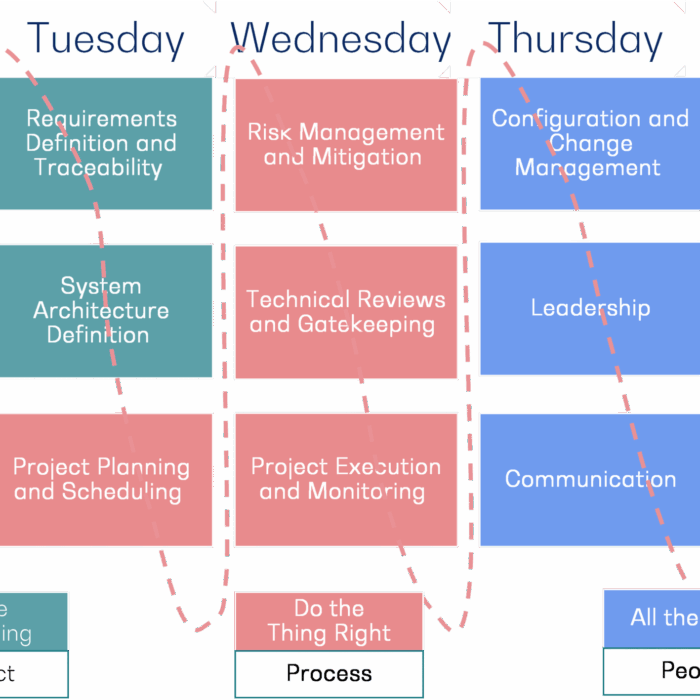 Kursen fokuserar på sambandet mellan Technical Management och Systems Engineering, med särskild vikt vid hur man styr projekt genom milstolpar, beslutsstöd och effektiv riskhantering.